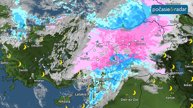 Meteoradar ukazuje v Turecku (okrem iného) aj silné sneženie.