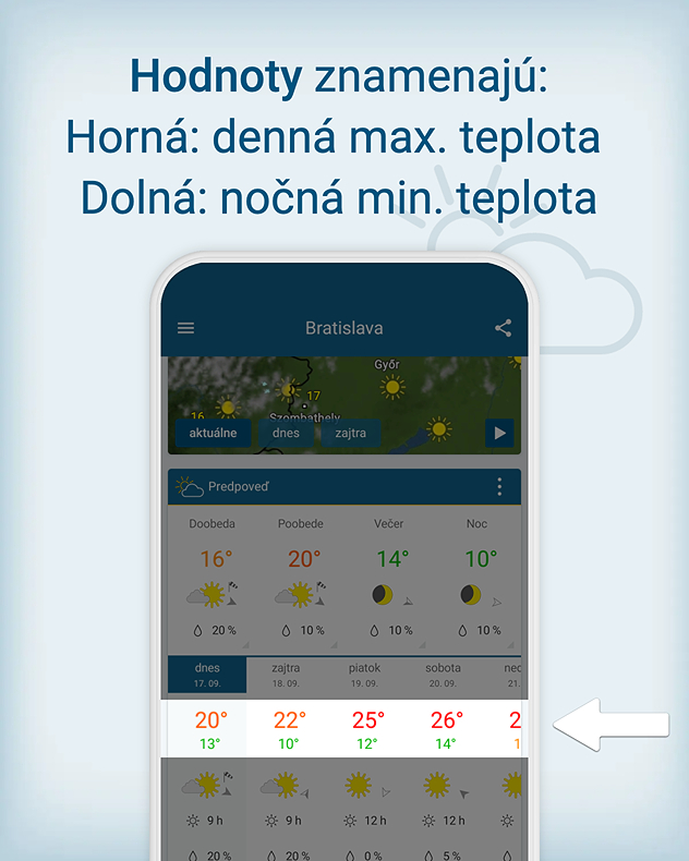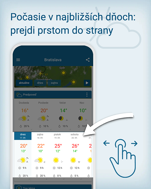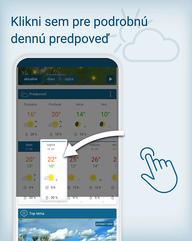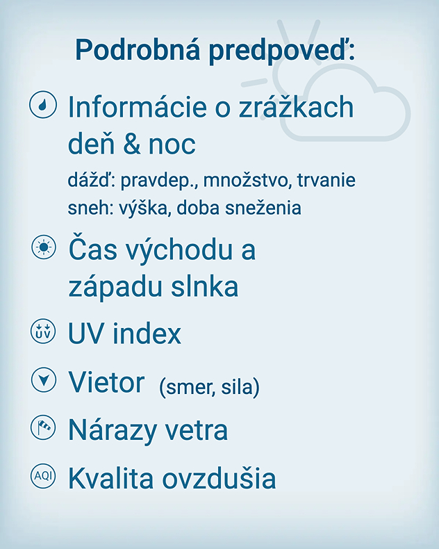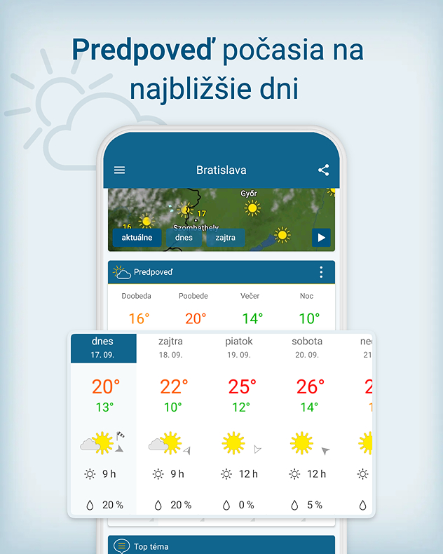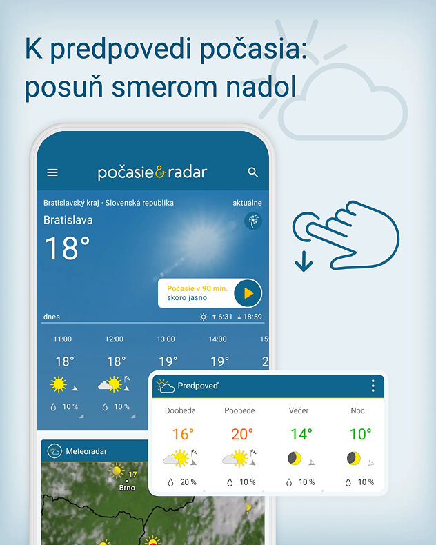 S aplikáciou Počasie & Radar môžete pomocou meteorologického radaru ľahko zistiť, aké bude počasie dnes ráno, popoludní, večer a v noci. Všetky tieto informácie sú tiež prehľadne a stručne prezentované v predpovedi na najbližšie dni.