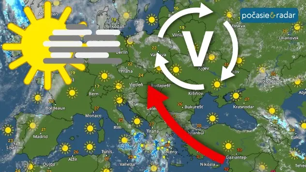 Mapa Európy s tlakovou nížou nad severom a prúdením vzduchu do strednej EurópyDostaneme sa do teplého, no už o poznanie vlhšieho vzduchu od juhu až juhozápadu. Počasie tak už nebude tak ideálne slnečné.