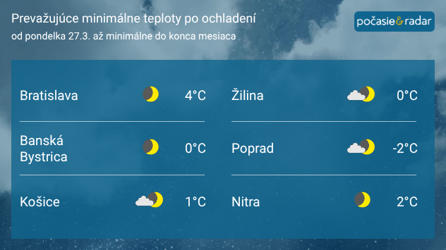 Prehľad maximálnych denných teplôt na Slovensku po ochladení – Bratislava 13 °C, Banská Bystrica 11 °C, Košice 11 °C, Žilina 9 °C, Poprad 8 °C, Nitra 13 °C